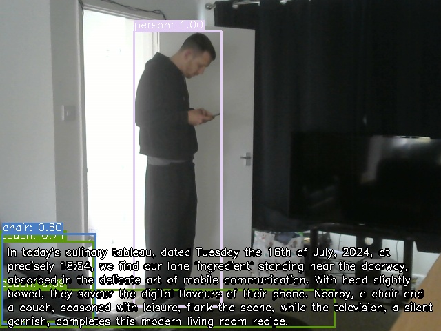 In today’s culinary tableau, dated Tuesday the 16th of July, 2024, at precisely 18:54, we find our lone ‘ingredient’ standing near the doorway, absorbed in the delicate art of mobile communication. With head slightly bowed, they savour the digital flavours of their phone. Nearby, a chair and a couch, seasoned with leisure, flank the scene, while the television, a silent garnish, completes this modern living room recipe.