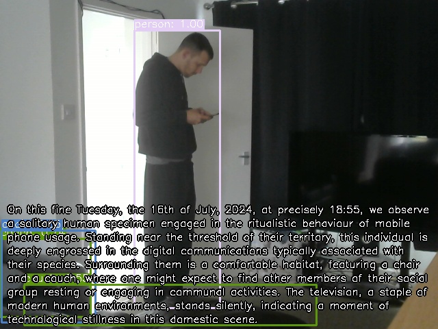 On this fine Tuesday, the 16th of July, 2024, at precisely 18:55, we observe a solitary human specimen engaged in the ritualistic behaviour of mobile phone usage. Standing near the threshold of their territory, this individual is deeply engrossed in the digital communications typically associated with their species. Surrounding them is a comfortable habitat, featuring a chair and a couch, where one might expect to find other members of their social group resting or engaging in communal activities. The television, a staple of modern human environments, stands silently, indicating a moment of technological stillness in this domestic scene.