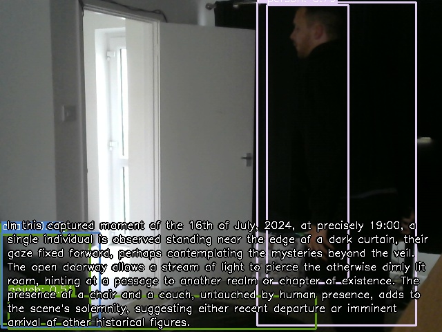 In this captured moment of the 16th of July, 2024, at precisely 19:00, a single individual is observed standing near the edge of a dark curtain, their gaze fixed forward, perhaps contemplating the mysteries beyond the veil. The open doorway allows a stream of light to pierce the otherwise dimly lit room, hinting at a passage to another realm or chapter of existence. The presence of a chair and a couch, untouched by human presence, adds to the scene’s solemnity, suggesting either recent departure or imminent arrival of other historical figures.