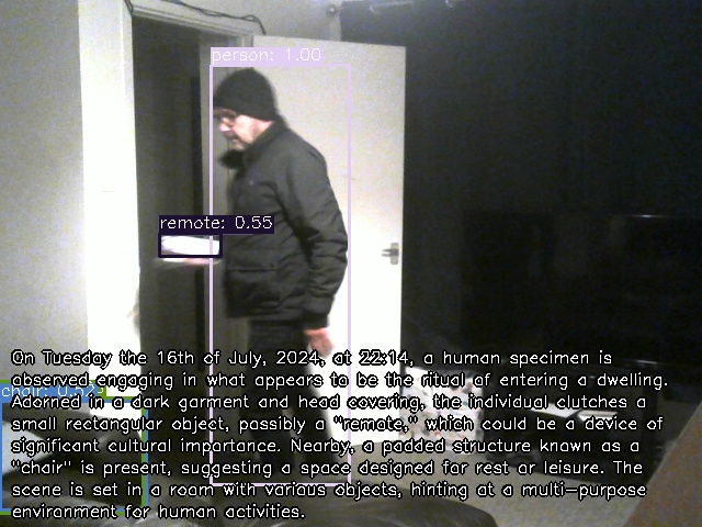 On Tuesday the 16th of July, 2024, at 22:14, a human specimen is observed engaging in what appears to be the ritual of entering a dwelling. Adorned in a dark garment and head covering, the individual clutches a small rectangular object, possibly a “remote,” which could be a device of significant cultural importance. Nearby, a padded structure known as a “chair” is present, suggesting a space designed for rest or leisure. The scene is set in a room with various objects, hinting at a multi-purpose environment for human activities.