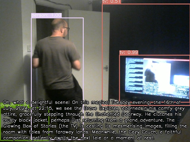 Oh, what a delightful scene! On this magical Tuesday evening, the 16th of July, 2024, at 22:15, we see the Brave Explorer, adorned in his comfy grey attire, gracefully stepping through the Enchanted Doorway. He clutches his trusty black jacket, perhaps just returning from a grand adventure. The Glowing Box of Stories (the TV) is casting its mesmerising images, filling the room with tales from faraway lands. Meanwhile, the Cozy Couch, a faithful companion, patiently awaits the next tale or a moment of rest.