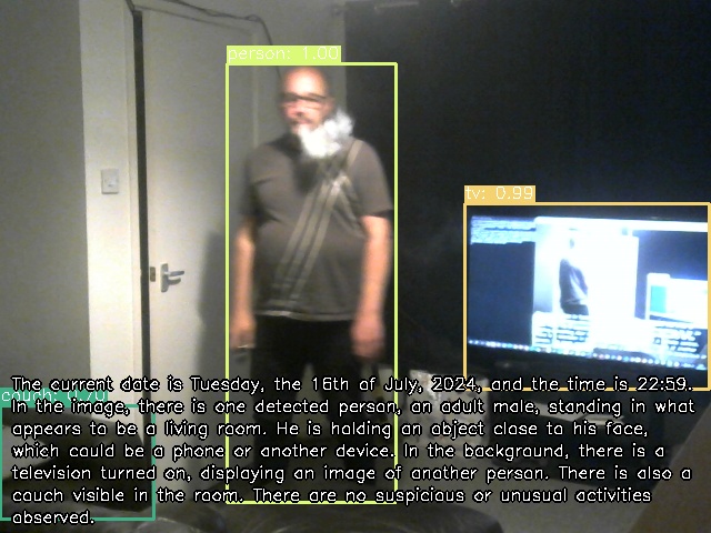 The current date is Tuesday, the 16th of July, 2024, and the time is 22:59. In the image, there is one detected person, an adult male, standing in what appears to be a living room. He is holding an object close to his face, which could be a phone or another device. In the background, there is a television turned on, displaying an image of another person. There is also a couch visible in the room. There are no suspicious or unusual activities observed.