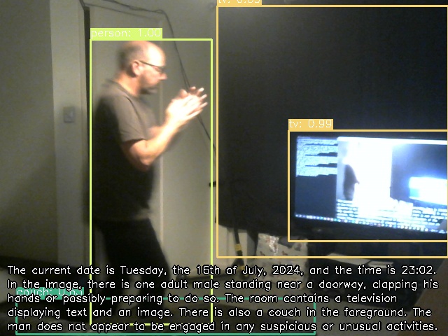 The current date is Tuesday, the 16th of July, 2024, and the time is 23:02. In the image, there is one adult male standing near a doorway, clapping his hands or possibly preparing to do so. The room contains a television displaying text and an image. There is also a couch in the foreground. The man does not appear to be engaged in any suspicious or unusual activities.