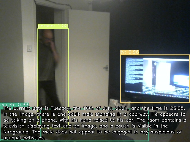The current date is Tuesday, the 16th of July, 2024, and the time is 23:05. In the image, there is one adult male standing in a doorway. He appears to be talking on a phone, with his hand raised to his ear. The room contains a television displaying text and an image, and a couch is visible in the foreground. The male does not appear to be engaged in any suspicious or unusual activities.