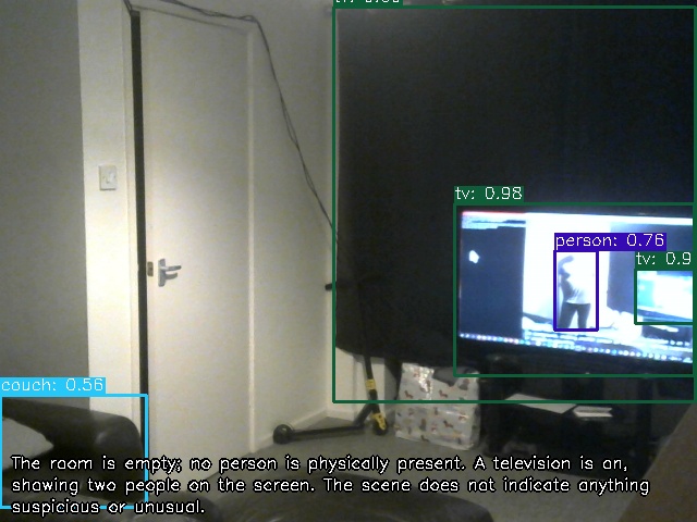 The room is empty; no person is physically present. A television is on, showing two people on the screen. The scene does not indicate anything suspicious or unusual.