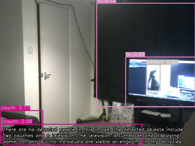 There are no detected people in this image. The detected objects include two couches and a television. The television is turned on and displaying some content, but no individuals are visible or engaging in any activities.
