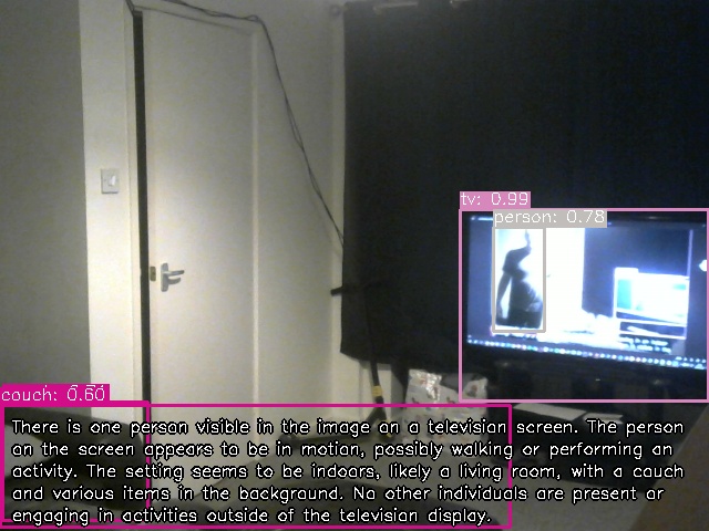 There is one person visible in the image on a television screen. The person on the screen appears to be in motion, possibly walking or performing an activity. The setting seems to be indoors, likely a living room, with a couch and various items in the background. No other individuals are present or engaging in activities outside of the television display.