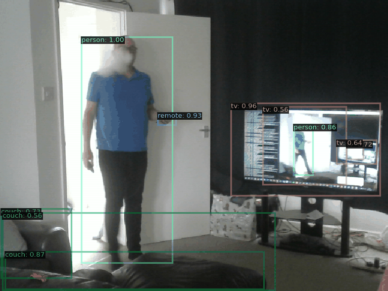 AI Commentary: In the animation, a person in a blue shirt is entering through a doorway while holding a remote control. The surrounding environment includes a couch and a television. The television screen displays a scene with another person, suggesting it may be in use for viewing something. The individual appears to be actively engaging with the remote, possibly preparing to change the channel or adjust the volume. The overall setting seems to be a living room.