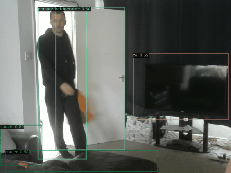 AI Commentary: In the animation, a person is entering the room through a door, holding an orange object in their right hand. The setting appears to be a living room, featuring a couch and a television in view. The person seems to be moving towards the interior of the room, while the couch occupies a prominent position in the foreground. The atmosphere suggests a casual, home environment.