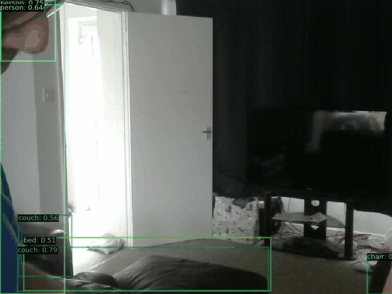 AI Commentary: In the animation, a person appears to be interacting with their environment, likely standing or leaning near a couch. The setting includes a door, a bed, and a television, suggesting a casual indoor space. The person might be engaged in an activity such as preparing to sit down, looking towards the door, or interacting with objects nearby. The overall atmosphere seems relaxed, typical of a living area.