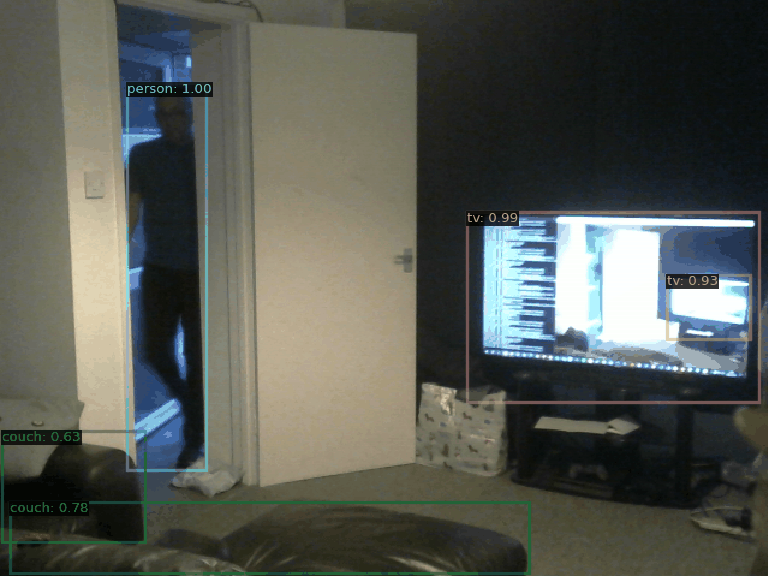AI Commentary: In the animation, a person is seen standing in a doorway, appearing to enter the room. The setting includes a couch and a television displaying some content. The atmosphere suggests a casual setting, likely a living room, where the person may be approaching the couch to interact with others or engage with the TV content.