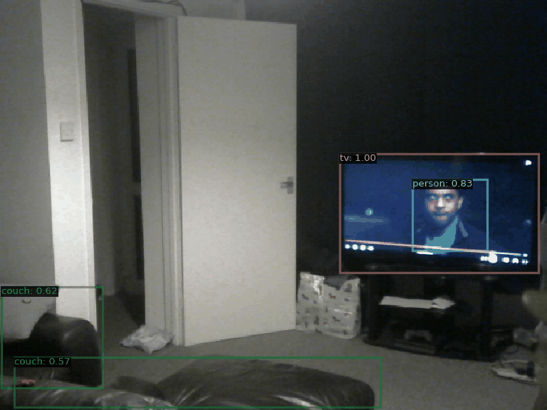 AI Commentary: In the animation, one person is visible, and they appear to be seated on a couch, possibly watching television. The TV displays an image of another individual, suggesting a video or a show is being broadcast. The environment looks casual and homey, with a door in the background and some items on the floor nearby. There’s no indication of any suspicious activity.