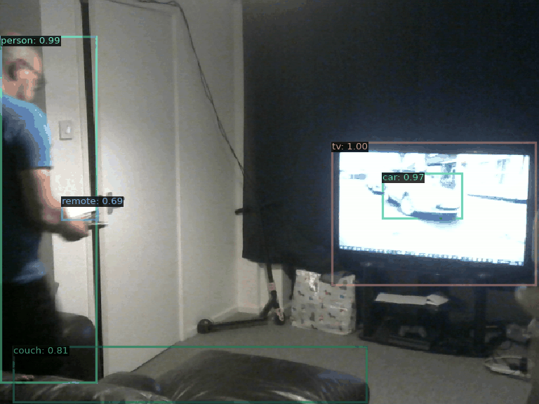 AI Commentary: In this animation, a person is standing near a door, holding a remote control in their left hand. They appear to be focused on a television that is on and displaying an image, possibly a scene with a car. The individual seems to be preparing to interact with the TV, likely aiming to change the channel or adjust the volume using the remote. The setting includes a couch in the foreground, indicating a casual living space.
