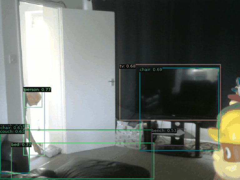 AI Commentary: In the animation, it appears that a person is moving around in a living room. They might be interacting with the environment, possibly approaching the door or the furniture in the room. There’s a television present, and various pieces of furniture like chairs, a couch, and a bed are visible, indicating a casual setting. The movement suggests a relaxed atmosphere, typical of a home environment.