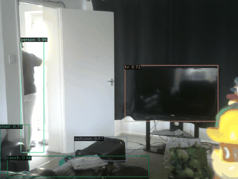 AI Commentary: In the animation, a person is interacting with a doorway, likely entering or exiting a room. The setting appears to be a living space where other objects such as a couch, suitcase, and a television are present. The person is dressed in casual attire and is partially turned towards the opening, suggesting they are in motion. The environment includes some unpacked items or bags on the floor, indicating a transitional or possibly busy situation in the room.