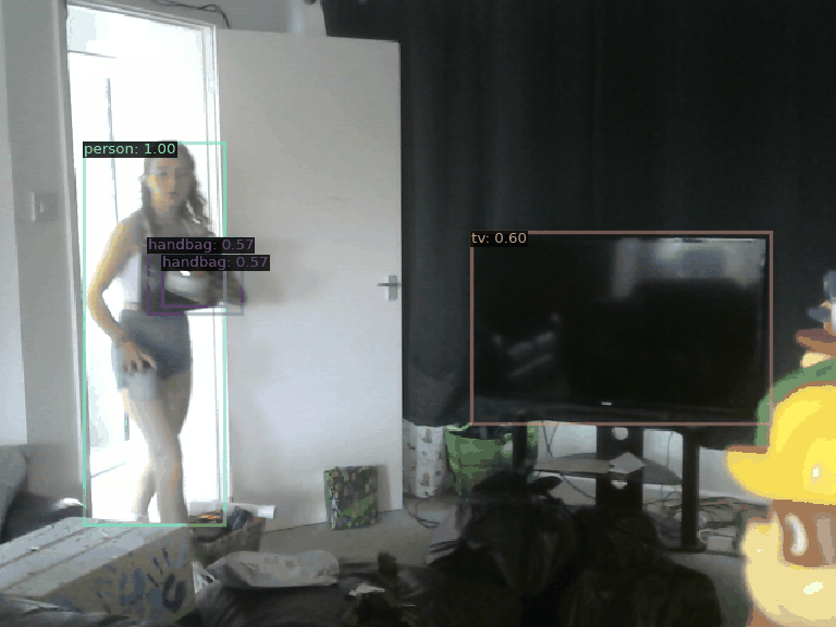 AI Commentary: In the animation, a person is seen standing near an open door, appearing to enter or exit. They may be holding a handbag. In the background, there is a television set visible, along with some items scattered on the floor, suggesting a casual indoor environment. The scene captures a moment of transition, possibly indicating that the person is coming in or going out of the room.