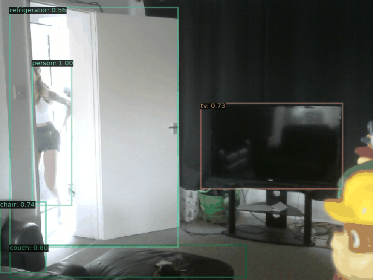 AI Commentary: In the animation, a person is entering a room through an open door. They appear to be stepping inside while carrying something. The room contains a couch and a television, suggesting a living area setup. The overall atmosphere seems casual, likely indicative of a home environment.