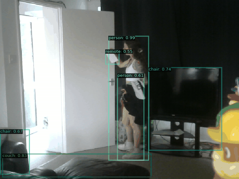AI Commentary: In the animation, two people are present in a room. One person appears to be standing near a door, possibly interacting with it or preparing to enter. This individual may be holding a remote control device. The second person is positioned nearby, likely sitting on a couch, and seems to be watching the first person closely. The setting includes furniture such as a chair and couch, with a television in the background, indicating a casual living space.